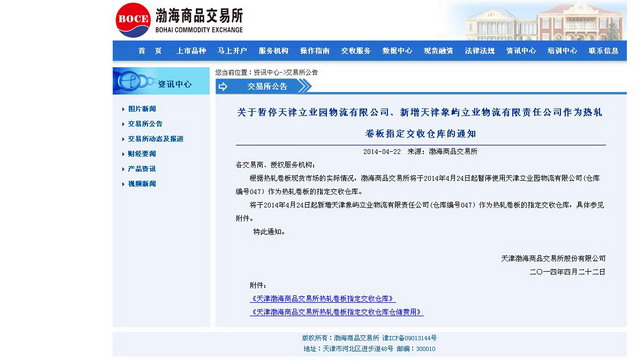 近日,天津象嶼立業(yè)物流有限責(zé)任公司與渤海商品交易所簽訂協(xié)議:天津象嶼立業(yè)物流有限責(zé)任公司成為渤海商品交易所于天津的指定交收倉庫。2014年4月23日,渤海商品交易所正式發(fā)布了市場公告。
