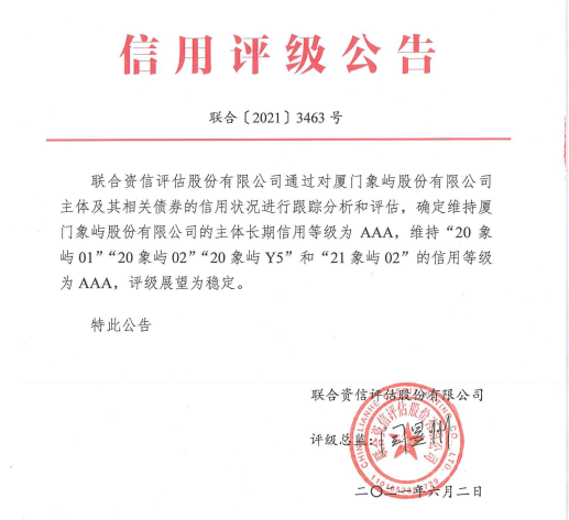 6月2日,權(quán)威評級機構(gòu)聯(lián)合資信評估股份有限公司(以下簡稱“聯(lián)合資信”)出具《廈門象嶼股份有限公司公開發(fā)行公司債券2021年跟蹤評級報告》,維持