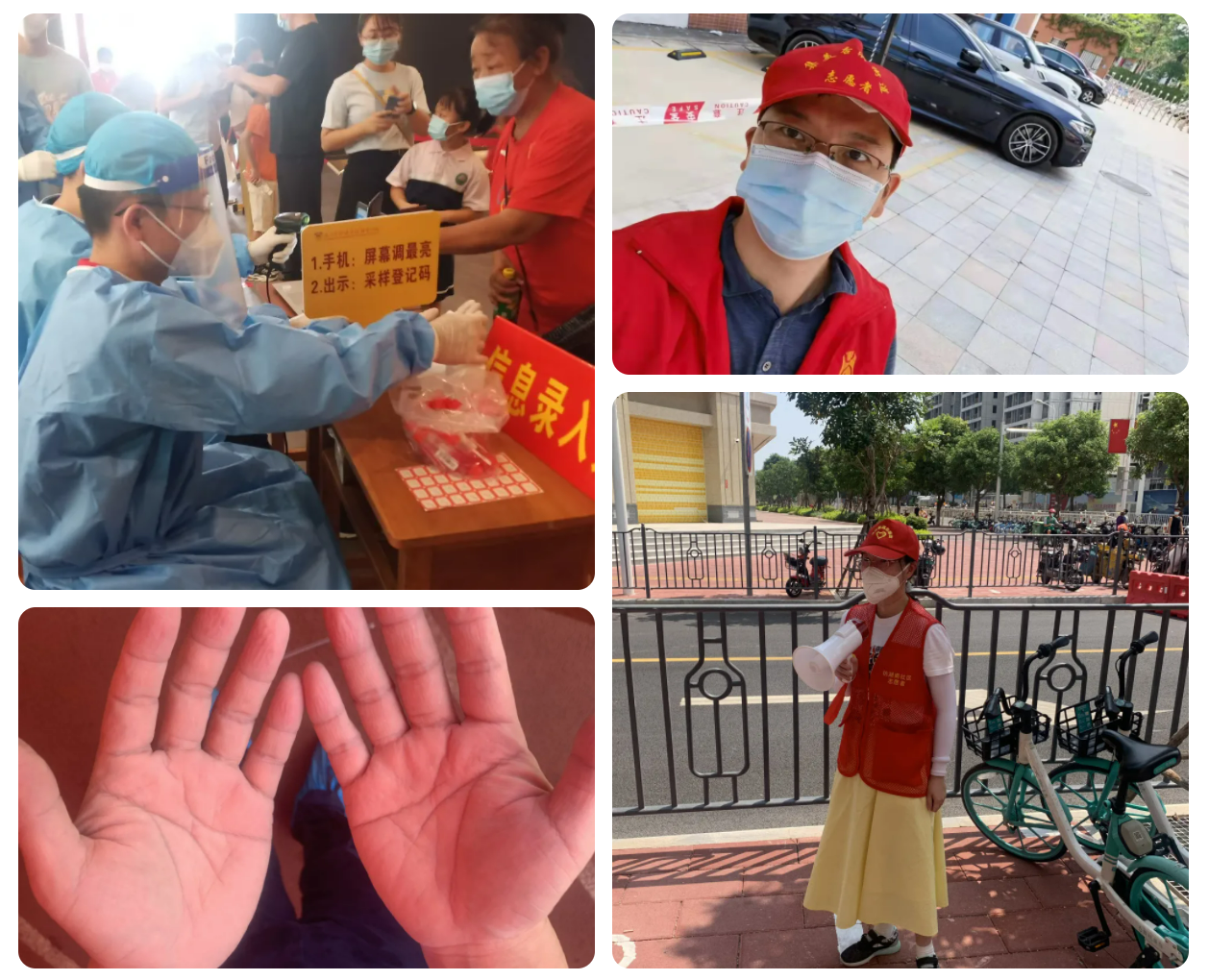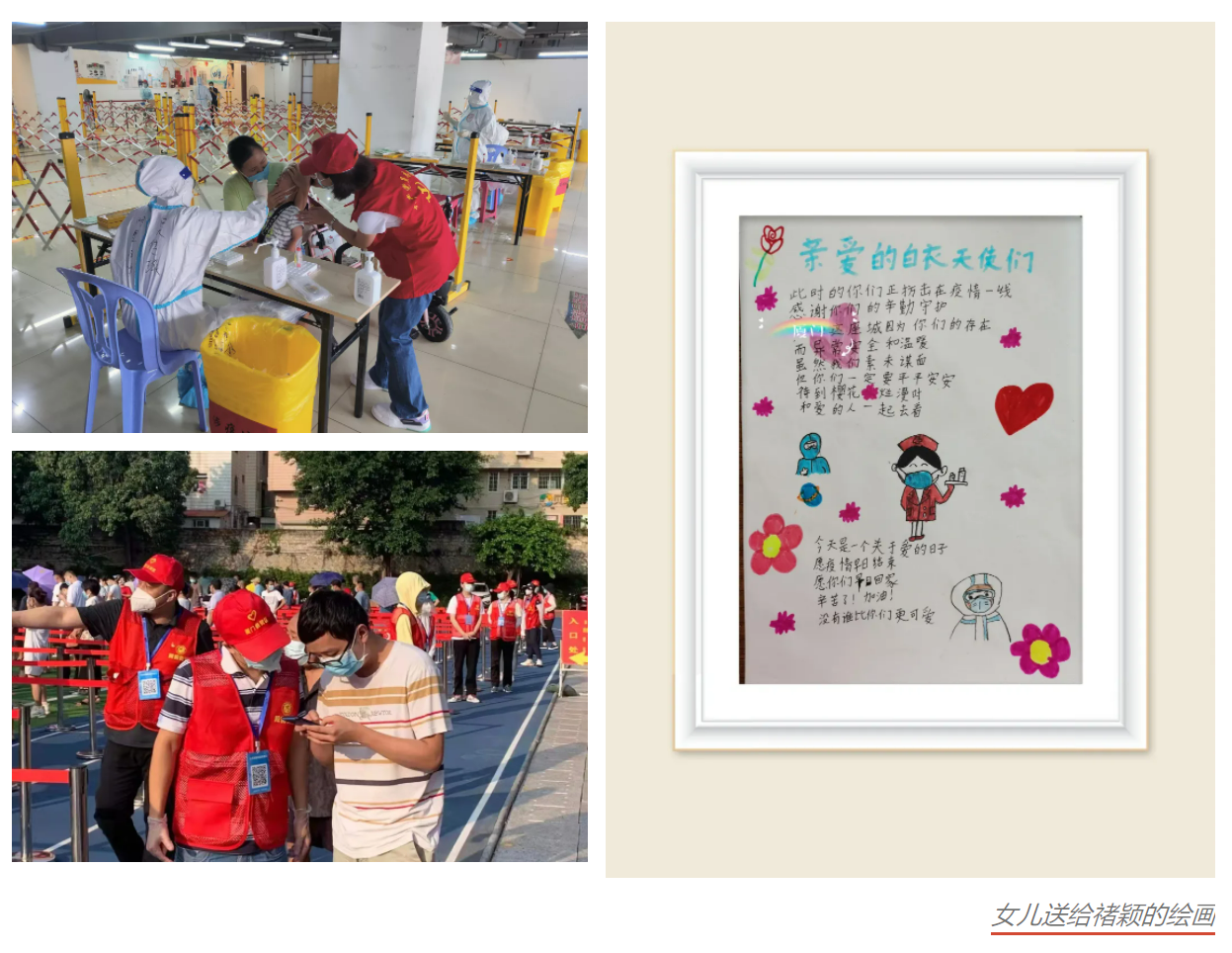 來(lái)自象嶼速傳黨辦的禇穎與她愛(ài)人更是雙方齊上陣,兩人錯(cuò)開(kāi)時(shí)間進(jìn)行志愿服務(wù),一人在外幫助市民進(jìn)行核酸檢測(cè),一人在家照顧孩子,既顧好“小家”也顧著“大家”。當(dāng)她完成志愿者任務(wù),給女兒看了自己的照片后,女兒忽閃忽閃的大眼睛直直地看著媽媽說(shuō):“媽媽?zhuān)娌蝗菀?,?yīng)該很熱吧!”夫妻二人用親身經(jīng)歷給孩子樹(shù)立了一個(gè)好榜樣!