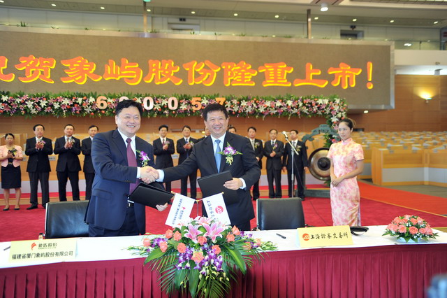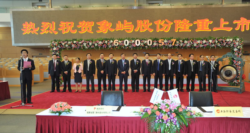 2011年8月29日,福建省廈門象嶼股份有限公司在上海證券交易所舉行隆重的重組上市儀式。廈門市人民政府葉重耕副市長(zhǎng)及象嶼股份王龍雛董事長(zhǎng)共同敲鑼開盤。象嶼股份股價(jià)高開逾1倍,開盤價(jià)8.25元,早市最高漲127.5%。截至早市收盤,報(bào)8.29元,漲108.29%。